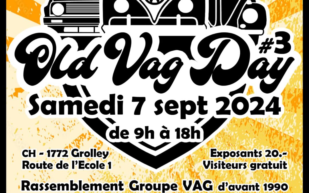 Meeting pour toutes les voitures du groupe VAG dâavant 1990 (aircooled, mk1 et mk2). Rdv le 7 septembre 2024 sur le parking de lâĂ©cole de Grolley (1772, canton de Fribourg). Foodtruck, animation, shops, top 6, place de jeux enfantsâŠ